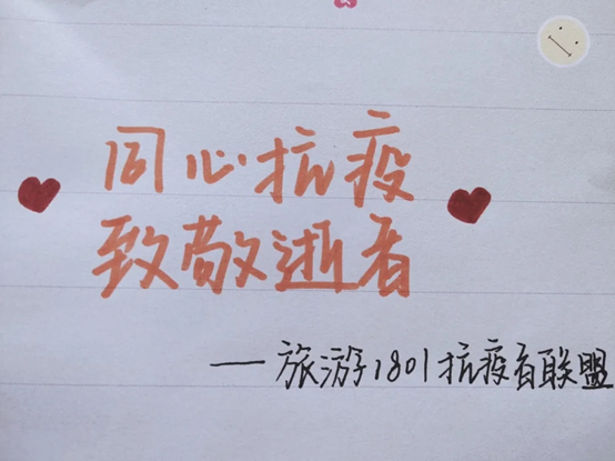 4月4日清明时节,上午十点全国哀悼三分钟,防空警报鸣响,汽车、火车、舰船同时鸣笛;作为中华儿女,为了响应“同心抗疫”的号召,在副班长苏晋仪以及团支书符瑶瑶的引导下,旅游1801抗疫者联盟就抗击疫情商量、编排短视频一则,以此致敬所有先烈和抗击一线的勇士们。