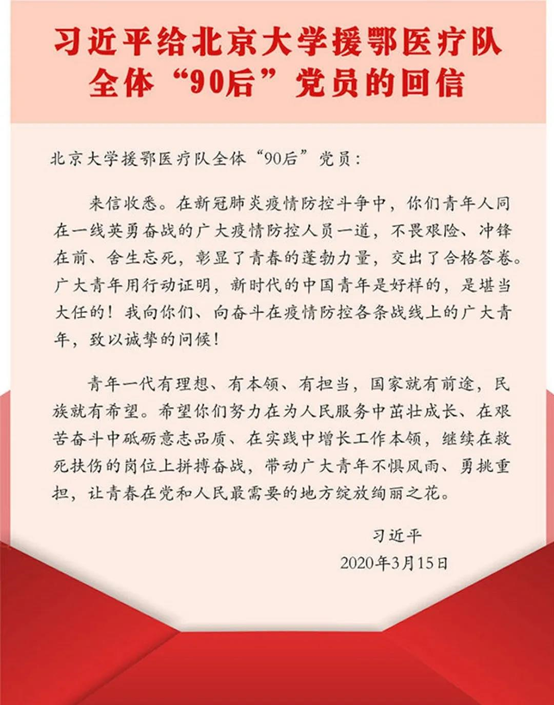 疫情防控是一场人民战争,每个党员都是一面旗帜,带动一群人汇聚起更强大的战疫力量。曾经小小的“90”后已然肩负起自己的责任扛起了民族担当,在收到习近平给北京大学援鄂医疗队全体“90后”党员的回信后,这些白衣天使们倍感振奋。