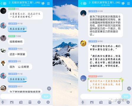 首先由班长向大家讲述珠峰测量队的事迹,在班级群内发布相关新闻资料和视频,并组织同学们讨论测量队攀登珠峰的意义。同学们观看视频后在群内积极发表自己的感想,结合当下实际情况和自身状况,体会勇攀珠峰背后的深刻内涵。